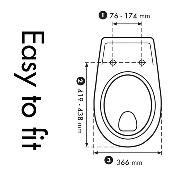 En raison de l'ajustement des charnières, et de sa forme ovale ce siège de toilette peut être adapté à la plupart des cuvettes de toilette courantes ovales. Nous recommandons de bien étudier le dessin au trait afin de vous assurer que le siège s'adapte parfaitement à votre cuvette. Enfin, avec le système de montage bien réfléchit 'Fastfix', vous pouvez facilement monter le siège de toilette par le bas.