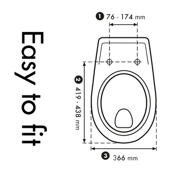 En raison de l'ajustement des charnières, et de sa forme ovale ce siège de toilette peut être adapté à la plupart des cuvettes de toilette courantes ovales. Nous recommandons de bien étudier le dessin au trait afin de vous assurer que le siège s'adapte parfaitement à votre cuvette. Enfin, avec le système de montage bien réfléchit 'Fastfix', vous pouvez facilement monter le siège de toilette par le bas.