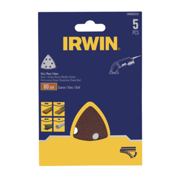 Les abrasifs delta Irwin IW8083210 conviennent pour toutes les ponceuses delta courantes avec semelle 92x92x92 mm. L'abrasif grain G80 donne une finition assez rugueuse, mais égalise rapidement. Grâce à la couche autocollante et à l'adhésion velcro, les abrasifs sont faciles à fixer et il n'y a pratiquement aucun jeu entre la feuille abrasive et la machine, ce qui augmente leur efficacité. Contenu: 5 pièces.