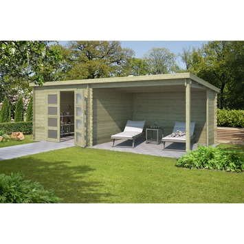 Abri de jardin Novia 28 mm + auvent vert imprégné 620x295 cm