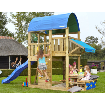 Idéal pour un pique-nique d'été, ou des activités telles que le dessin, de l'artisanat, des clubs d'amis, des devoirs, des jeux et des fêtes pour enfants. De surcroît, cet équipement d'aire de jeux aventureux est équipé de 2 hauteurs de plate-forme, d'un toit de tente en forme de dôme et d’options de jeux supplémentaires tels qu'un mur d'escalade avec des pierres de couleur, un périscope, un toboggan avec raccordement d'eau en option et un bac à sable.