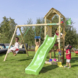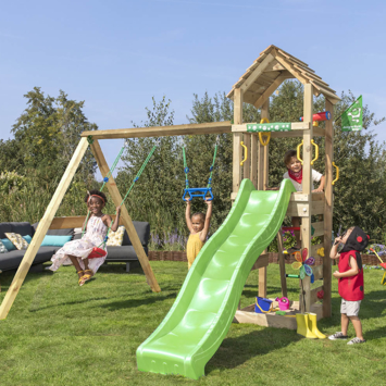 Aire de jeux Jungle Gym Cocoon en pin avec toboggan vert et 2 balançoires