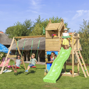 Aire de jeux Jungle Gym Resort en pin avec toboggan vert et 2 balançoires