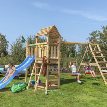 Aire de jeux Jungle Gym Safari en pin avec toboggan bleu et mur d'escalade