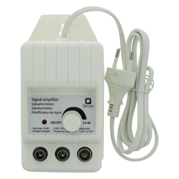 Cet amplificateur d’antenne à 2 sorties renforce votre signal de manière optimale. Placez l’amplificateur dans votre installation existante pour éviter les perturbations et les parasites dus à un signal affaibli. La sortie 1 renforce le signal coax entrant jusqu’à maximum 10 dB, tandis que la sortie 2 renforce le signal jusqu’à maximum 6 dB. Il vous incombe de paramétrer vous-même les deux sorties. Pratique: l’amplificateur d’antenne Q-link possède une alimentation intégrée. Une fois installé, vous ne devez plus vous en soucier.