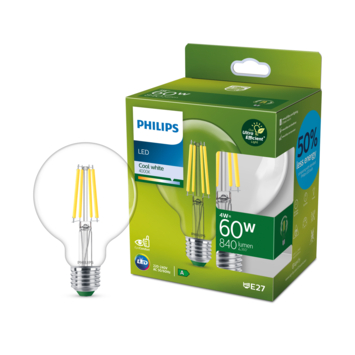 Illuminez votre espace avec la lampe la plus économe en énergie. Cette ampoule à filament LED globe de Philips, notée A pour son efficacité, réduit la consommation d'énergie de 50 % et a une durée de vie 3,5 fois plus longue qu'une ampoule LED standard, vous permettant de réaliser des économies significatives sur vos factures d'électricité. Avec une longévité allant jusqu'à 50 ans, elle réduit également le gaspillage de matériaux, contribuant ainsi aisément à la protection de l'environnement. Le LED, ça le fait ! Cette lampe à culot E27 diffuse une lumière blanc froid, semblable à la lumière naturelle du jour.