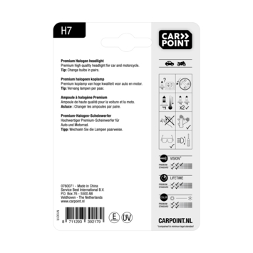 Un éclairage qui fonctionne correctement est important. Vous n'êtes pas seulement visible dans la circulation, mais vous avez également une meilleure vue de vous-même. La lampe de voiture halogène H7 Carpoint Premium est un phare avec feux de croisement, feux de route et antibrouillard pour la fonction. Cette version Premium offre jusqu'à 10 % de visibilité en plus. Cette lampe de rechange de 12 volts a une capacité de 55 watts, l'approbation E et est fournie par pièce dans un blister. Il est sage de remplacer les deux phares en même temps. Au fur et à mesure que la lampe a plus d'heures de fonctionnement, la lampe devient plus faible. Ce problème est résolu en remplaçant les deux lampes et la voiture a la bonne image lumineuse. Et l'expérience montre que si une lampe tombe en panne, l'autre suivra souvent dans un avenir prévisible. CONSEIL : Tenez toujours la lampe halogène par le raccord et jamais par le verre. Les doigts gras peuvent se brûler et former un dépôt noir sur le verre. En conséquence, la lampe donne moins de lumière et la durée de vie est raccourcie. Lors du remplacement de la lampe, utilisez un chiffon au cas où vous ne pourriez assembler la lampe qu'en la tenant par le verre.
