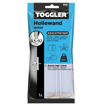 L'ancrage mural creux Toggler M6 convient à la fixation d'objets aux murs et aux plafonds. Pensez à une rampe, un placard, un plafonnier ou un radiateur. Vous montez l'ancrage pour mur creux rapidement et facilement dans toutes les épaisseurs de plaque de 10 mm à 92 mm, telles que les plaques de plâtre doubles, les plaques de bois, les panneaux de fibres et le béton cellulaire de 7 cm. L'espace derrière la plaque est-il supérieur à 52 mm ? Dans ce cas, l'ancrage pour mur creux Toggler s'adapte toujours. Un ancrage mural creux a une grande surface d'appui, de sorte que l'ancrage assure une fixation solide en combinaison avec un boulon M6. Même lorsque le boulon est dévissé, l'ancre reste en place dans un mur creux. Peu importe la fréquence à laquelle vous vissez ou dévissez le boulon, l'adhérence reste optimale. Le diamètre de perçage est de 13 mm et l'ancrage mural creux M6 peut supporter une charge maximale de 268 kg. Évidemment en fonction du matériau dans lequel l'ancre est montée. Vous achetez l'ancrage mural creux M6 de Toggler par paquet de 2 pièces.