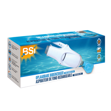 Aspirateur de fond rechargeable sans fil Idéal pour petits spas et piscines Batterie lithium performante (30 min performance constante) et rechargeable Câble recharge USB Enclenchement automatique grâce au capteur d’eau Interrupteur marche/arrêt de sécurité pour l’entreposage Tête aspirante avec roues et brosses Se connecte au manche télescopique (inclus)