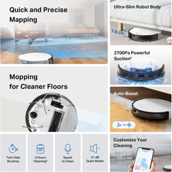 Avec le système de navigation MagSlim™ LiDAR avancé, L'aspirateur robot TP-Link Tapo RV20 crée une carte précise de votre maison en quelques minutes. Ce système garantit qu'aucun endroit n'est oublié ou nettoyé deux fois, et il permet même le nettoyage dans l'obscurité. Avec une puissance d'aspiration élevée de 2700 Pa, cet aspirateur robot Tapo aspire facilement les poils d'animaux, la saleté quotidienne et plus encore. Les quatre niveaux d'aspiration offrent une flexibilité pour différents besoins de nettoyage. Le TP-Link Tapo RV20 aspire la poussière flottante et la serpillère intégrée peut traiter les saletés collantes pour une expérience de nettoyage complète. Avec une batterie puissante de 2600mAh, il peut nettoyer sans interruption pendant 3 heures, parfait pour les grandes maisons. Lorsque la batterie est presque déchargée, l'aspirateur robot retourne automatiquement à la station de recharge. Ensuite, il reprend le nettoyage là où il s'était arrêté. Deux brosses latérales Les deux brosses latérales garantissent que tous les coins et bords sont nettoyés sans disperser la saleté, ce qui donne un nettoyage encore plus complet. Conception ultra-mince de 7,8 cm Grâce à son design ultra-mince de seulement 7,8 cm, le TP-Link Tapo RV20 se déplace sans effort sous les meubles pour éliminer la poussière et la saleté cachées. Nettoyage personnalisé Fusionnez ou séparez des pièces, définissez un programme de nettoyage et créez des modes de nettoyage personnalisés pour chaque pièce. Le TP-Link Tapo RV20 offre une flexibilité totale dans votre routine de nettoyage. Avec un niveau sonore de seulement 51 dB, le TP-Link Tapo RV20 nettoie votre maison sans déranger vous ou vos animaux de compagnie. Prise en charge des mises à jour OTA Maintenez votre aspirateur robot à jour avec la dernière version du firmware via l'application Tapo. Profitez d'une meilleure expérience et de plus de fonctionnalités à l'avenir.