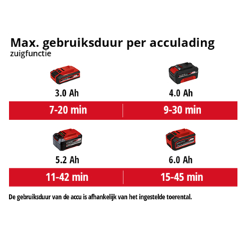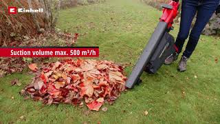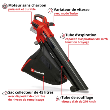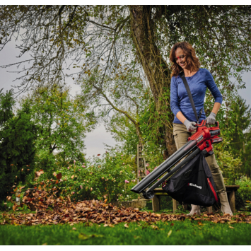 Avec l’aspirateur-souffleur de feuilles sans fil VENTURRO 18/210 Einhell, finie la corvée de ramassage des feuilles ! Le puissant aspirateur de feuilles sans fil 18 V fonctionne sans aucun câble. Il se transforme en souffleur de feuilles et comprend un système de broyage intégré. Cet appareil sans fil fait partie de la puissante gamme Power X-Change Einhell, dans laquelle les batteries, chargeurs et appareils peuvent être combinés en toute flexibilité. Avec une puissance d’aspiration de 500 m³ /h, cet appareil de 3 kg aspire en un tour de main de grandes quantités de feuilles et les réduit à un dixième de leur volume initial grâce à la fonction de broyage intégrée, avant de les évacuer dans le grand sac collecteur de 45 L. Le sac collecteur de haute qualité est doté d’une fenêtre de contrôle du niveau de remplissage et se clipse rapidement et facilement sur l’appareil. Le commutateur permet de passer à tout moment de la fonction aspiration à la fonction soufflage très facilement. Utilisé comme souffleur de feuilles, l’appareil souffle les feuilles avec un débit d’air maximal de 210 km/h. Le variateur électronique permet de régler individuellement la puissance d’aspiration et de soufflage, avec un effet simultané sur le niveau sonore. La poignée auxiliaire permet de manœuvrer efficacement l’aspirateur-souffleur de feuilles sans fil des deux mains, la sangle de transport assurant quant à elle une décharge optimale du poids. Les 2 grandes roues situées à l’extrémité du tube d’aspiration permettent de déplacer facilement l’aspirateur-souffleur de feuilles sans fil même sur les terrains accidentés, tout en ménageant le dos. Rangement peu encombrant de l’appareil grâce au support mural intégré