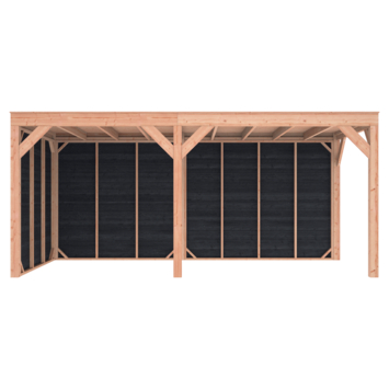 Cet auvent au design moderne offre un équilibre parfait entre esthétique et fonctionnalité. Les dimensions sont de 244,8 cm de hauteur, 545,4 cm de largeur et 254,9 cm de profondeur et la hauteur de passage est de 224 cm. Aspect naturel, belle qualité.Les murs sont recouverts de clins suédois noirs et la construction est en Douglas non traité avec des montants robustes de 12x12 cm.Le choix du bois Douglas non traité offre un aspect authentique et garantit également une longue durée de vie.Prêt pour un avenir vert : cet abri de jardin au design moderne est spécialement conçu pour supporter des panneaux solaires ou un toit en sedum. Cela fait de cet auvent un ajout durable et respectueux de l'environnement.Installation Grâce à la description de construction claire, aux matériaux de montage fournis et aux pièces découpées sur mesure, l'installation de cet auvent de jardin est un travail réalisable pour tout bricoleur moyen. Revêtement de toit : Nous recommandons d'équiper cet auvent Douglas d'un revêtement de toit en EPDM pour un toit sans fuite (remarque : doit être commandé séparément).Entretien : Lors de l'achat d'un auvent, l'entretien est un point d'attention... Avec le bois Douglas, vous vous en sortez bien, car le Douglas est une essence de bois résistante. Elle peut facilement durer 10 à 15 ans sans traitement supplémentaire. Pour prolonger la durée de vie maximale, vous pouvez utiliser une lasure spéciale Douglas ou de l'huile Douglas et renouveler le traitement tous les 2 ans.