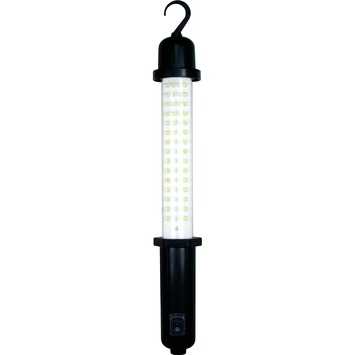 Lampe de travail rechargeable, sans fil, avec crochet et interrupteur. Avec adaptateur 230 V et adaptateur auto. Faible consommation (60 LED correspondent à peu près à un TL 8 W), très pratique.