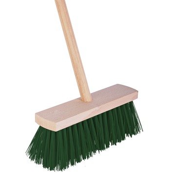 Ce balai de 28 cm de large en poils synthétiques, est adapté à une utilisation en extérieur. Le balai est également idéal pour les surfaces humides, le nylon fait en sorte que les poils ne collent pas ensemble lorsqu'ils sont humides. Après utilisation, ne posez pas le balai avec les poils sur le sol. Il est préférable de l'accrocher ou de le poser avec la poignée sur le sol. Si vous posez le balai avec les poils sur le sol, il y a un risque que les poils se plient et que l'utilisation ne soit plus optimale.