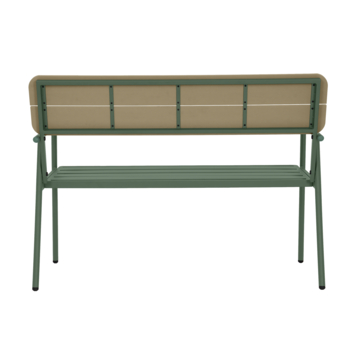 Le banc dispose d’un cadre métallique robuste avec dossier, garantissant une assise stable et confortable. L’assise et le dossier sont réalisés en polymère, une combinaison qui crée un ensemble moderne et épuré, facile à associer avec d’autres meubles de jardin.