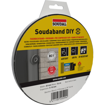 Avec le Soudal Soudaband compribande DIY BG1 20/5-10, vous pouvez facilement sceller les joints de dilatation et les raccordements. Cette bande d'étanchéité précompressée possède un côté adhésif et est facile à poser. Après l'application, la bande se dilate et remplit complètement le joint.