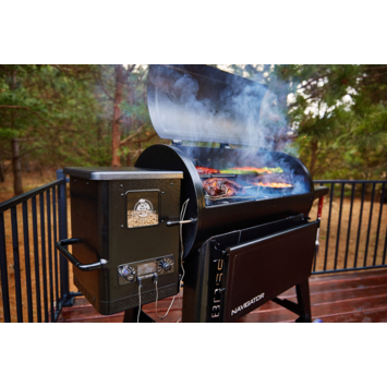Le barbecue Pit Boss Navigator 850 vous procure la saveur du bois véritable. Ce barbecue design et sophistiqué offre tout ce que vous pouvez attendre d'un gril de haute qualité. La grande surface de cuisson, capable de préparer de délicieux repas pour 8 à 10 personnes sur 2 niveaux. Grâce à une technologie de grillade avancée et aux granulés alimentaires de bois dur 100 % naturel, profitez de caractéristiques « Bigger, Hotter, Heavier » qui ne peuvent être obtenues qu'avec un barbecue Pit Boss. Le Navigator 850 offre une multitude de méthodes de cuisson : fumer, cuire, braiser, rôtir, griller, saisir vos différents aliments et griller au charbon de bois. Réglez la température de 82° à 260°C et obtenez une chaleur directe ou indirecte instantanée grâce à la plaque de diffusion de chaleur brevetée, réglable par levier. Ce système passe facilement d’une cuisson indirecte à une cuisson directe afin d'atteindre des températures de saisie proches de 535 °C. Les 2 grilles de cuisson en fonte émaillée vous garantissent une bonne répartition de la chaleur sans que les aliments n'adhèrent. Il est très facile de retourner proprement les grillades, les brochettes et des saucisses. Doté de 2 sondes, 1 sonde intégrée qui régule la température interne et 1 sonde externe fournie qui se branche sur le panneau de contrôle numérique afin de suivre la cuisson à cœur des aliments. Ce suivi permet des préparations et des résultats ultra précis sans avoir à ouvrir le couvercle !