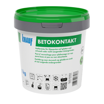 Betokontact de Knauf (1 kg) est un pont d'accrochage pour les enduits de plâtre sur des supports lisses. Permet de traiter des supports peu solides ou présentant peu d'adhérence pour pouvoir y accrocher plus aisément votre enduit.