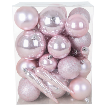 Boules de Noël plastique rose poudré avec étoile 33 pièces