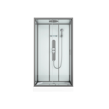 Cette cabine de douche Allibert Uyuni 120x80x225 cm rectangulaire 1 mur est très facile à installer avec son système de clips et sans forer, en 1 heure de montage et sans silicone. La cabine complète comprend un receveur en acrylique renforcé, des parois et portes anti-calcaire, faciles à nettoyer et une robinetterie de qualité. La structure « minimaliste droite » est en aluminium chromé. Les portes sont transparentes, les parois de fond blanches. Son panneau de commande en acier inoxydable permet de commander son besoin d'eau. Le choix est large: des jets hydromassants issus d'un panneau d'hydromassage en acier laqué noir composé de jets massage anti-calcaire; une douchette à main 3 fonctions, une tête de douche en acier laqué noir 25 x 25 cm intégrée dans le toit blanc en verre blanc.