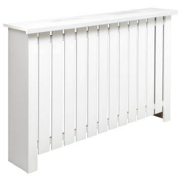 Zoals op bovenstaande afbeelding is te zien, lijkt er ook sprake te zijn van een 'vensterbank' en zijpanelen. Een compleet pakket dus. Beiden zijn helaas in het pakket afwezig. Er is nu geen staande constructie, kan het hekje dus alleen tegen de verwarming aan laten leunen.