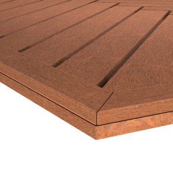 La dalle de terrasse est en Keruing non traité. Ce type de bois provient d'Asie du Sud-Est et est de couleur brun rougeâtre clair à foncé. Le bois de Keruing appartient à la classe de durabilité 3 et a une durée de vie d'environ 10 à 15 ans sans traitement. Le bois de Keruing raboté est séché artificiellement pour éviter les fissures.