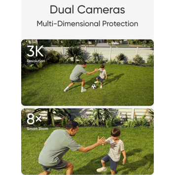 • Le téléobjectif de la caméra capture chaque détail en résolution 3K jusqu'à 15 m tandis que la caméra grand angle offre une vue d'ensemble. L'association des deux caméras permet d'obtenir un zoom numérique x 8.
