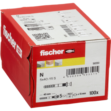 Vous utilisez cette cheville à clouer Fischer N5x40 Z, emballée par 100 pièces, pour monter des lattes en bois sur différents matériaux. Pensez au béton, à la connexion murale et au métal. Utilisez une perceuse d'un diamètre de 5 mm pour percer le trou dans lequel vous installerez la cheville à clou. Insérez ensuite la cheville à clou de 40 mm de long et vissez la vis de 48 mm d'un diamètre de 3,5 mm. Après assemblage, cette cheville à clous d'une longueur de 4 cm peut être chargée avec un maximum de 16 kg, selon le matériau dans lequel vous fixez la cheville. Vous achetez la cheville à clous Fischer N5x40Z par 100 chevilles à clous.