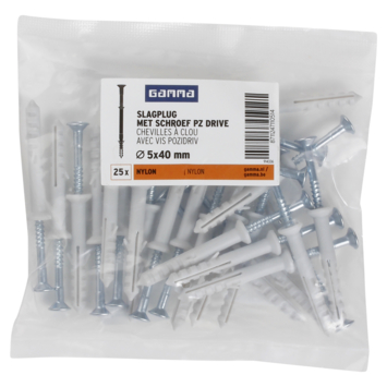 La cheville marteau GAMMA nylon Ø 5x40mm avec vis convient pour une utilisation sur différents types de matériaux tels que le béton, les raccords muraux et le métal. Les chevilles à clous sont très appropriées pour le montage de lattes en bois (comme les plinthes). La méthode de travail est différente d'un plug normal et c'est pourquoi ce plug est également appelé plug à clou ou plug à clou. Vous frappez le bouchon dans le trou de forage avec un marteau. Utilisez une perceuse d'un diamètre de 5 mm pour percer le trou. La prise mesure 40 mm de long. Les vis correspondantes mesurent 45 mm de long et ont un diamètre de Ø 3,3 mm. Un paquet contient 25 chevilles marteaux.