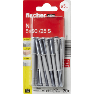Ces chevilles marteau N 5x50mm/25 S de Fischer conviennent à différents types de matériaux tels que le béton, le raccordement mural et le métal. Les chevilles à marteau, également appelées chevilles à clous ou chevilles à clous, conviennent très bien au montage de lattes en bois (comme les plinthes). Vous frappez le bouchon dans le trou de forage avec un marteau. Les bouchons d'impact peuvent être chargés jusqu'à 16 kg, selon le matériel que vous attachez avec eux. Utilisez un foret de 5 mm de diamètre pour percer le trou. Le bouchon mesure 50 mm de long et la vis mesure 58 mm et a un diamètre de 3,5 mm. Les chevilles sont très appropriées pour le montage de lattes en bois. Un paquet contient 20 chevilles marteaux.