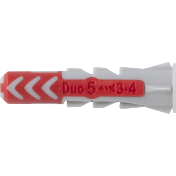 La fiche Duopower 5x25 mm convient à la fois à l'installation en amont et en aval. Plus de matière dans le bouchon pour encore plus de répartition et une capacité de charge encore plus élevée. La combinaison d'un plastique dur et souple garantit une facilité d'utilisation optimale, une installation très facile et, de plus, un retour clair lorsque la prise est correctement placée. Convient pour les vis à bois, à panneaux de particules et à suspension. Longueur de vis = longueur de cheville + épaisseur de fixation + 1x diamètre de vis. Dans le cas d'un matériau en feuille, la partie lisse de la vis ne doit pas être plus longue que l'épaisseur de la fixation. L'association de 2 matériaux et de 3 principes de fonctionnement fait de DUOPOWER la prise adaptée à toutes les circonstances. Le bouchon active le principe de fonctionnement optimal - étalement, pliage, nouage - en fonction du support. Meilleur retour possible de la prise, cela se ressent clairement lorsque la vis est bien serrée. La cheville courte et compacte signifie un temps de perçage minimal et donc une économie de matériel et de temps. Le collier mince empêche la cheville de disparaître dans le trou de forage lorsqu'il est utilisé dans des murs creux, tout en permettant une installation traversante. Les ailes anti-rotation dentées empêchent la cheville de tourner dans le trou de forage lors de l'installation. L'emballage est de 45 pièces.