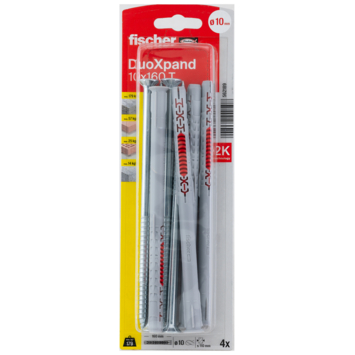 La cheville rallongée fischer DuoXpand avec deux profondeurs d'ancrage avec la vis à tête fraisée fischer est agréée pour la fixation multiple d‘applications non structurelles dans tous les matériaux de construction (béton, la maçonnerie pleine et creuse et le béton cellulaire). En raison de sa géométrie lamellaire spéciale et de la combinaison de matières, la cheville s'expanse de manière optimale et en douceur dans le matériau de construction évitant ainsi d’endommager les parois des matériaux creux et permettant un ancrage près du bord. La cheville DuoXpand avec vis à tête fraisée est particulièrement adaptée à la fixation d'éléments en bois dans le béton et la maçonnerie.