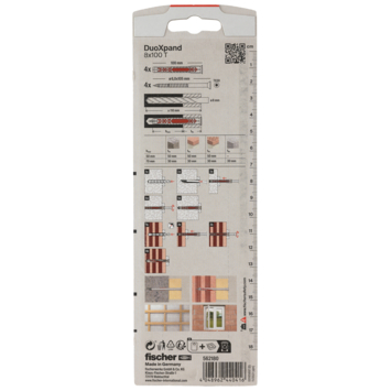 La cheville rallongée fischer DuoXpand avec deux profondeurs d'ancrage avec la vis à tête fraisée fischer est agréée pour la fixation multiple d‘applications non structurelles dans tous les matériaux de construction (béton, la maçonnerie pleine et creuse et le béton cellulaire). En raison de sa géométrie lamellaire spéciale et de la combinaison de matières, la cheville s'expanse de manière optimale et en douceur dans le matériau de construction évitant ainsi d’endommager les parois des matériaux creux et permettant un ancrage près du bord. La cheville DuoXpand avec vis à tête fraisée est particulièrement adaptée à la fixation d'éléments en bois dans le béton et la maçonnerie.