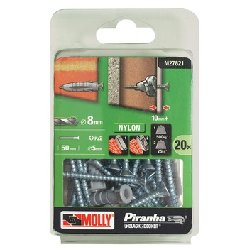 La cheville universelle Molly M27821 en nylon s'utilise dans des supports pleins ou creux épais d'au moins 10 mm. Les chevilles sont livrés avec des vis PZ2 de 5 mm de diamètre ayant une longueur de 50 mm. Forez un trou de 8 mm de diamètre. En emballage de 20 pièces.