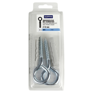 La cheville universelle GAMMA HDPE Ø 12mm avec piton à oeil à visser peut être utilisé pour plusieurs matériaux. La cheville convient au béton, à la pierre pleine et perforée, ainsi qu'aux murs creux. La tête du bouchon est tirée vers l'arrière par la vis et forme une sorte de nœud dans les matériaux de construction creux. Une cheville pratique à avoir en stock, pour avoir toujours une adaptée sous la main. Le bouchon mesure 60 mm de long, pour un résultat optimal, nous recommandons une profondeur de perçage minimale de 70 mm. Un paquet contient 2 bouchons et 2 œillets à visser.