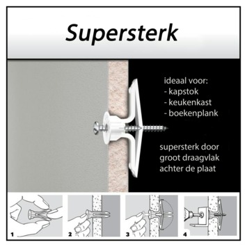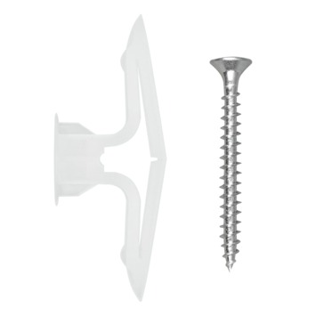 La cheville murale creuse en plastique Toggler TB-6 avec vis, 6 pièces, est utilisée pour la fixation d'objets en tôle, tels que des plaques de plâtre ou des panneaux de bois et de fibres, de 9 mm à 13 mm d'épaisseur. Une cheville murale creuse (cheville à bascule) possède de grandes ailettes anti-rotation qui empêchent la cheville de tourner lorsque vous vissez une vis. Vous montez la cheville dans des murs creux à l'aide de la goupille fournie. Cela rend le montage de la prise simple et rapide. La cheville murale creuse de 9 mm à 13 mm a une grande surface d'appui derrière la plaque et offre donc une bonne prise en main. Vous pouvez donc charger les chevilles jusqu'à 70 kg, selon le matériau. Avec la cheville murale creuse TB-6, vous pouvez par exemple fixer des armoires ou des appareils de cuisine. Ces objets sont fixés en combinaison avec des vis entièrement filetées de 3,5 mm à 6 mm d'épaisseur et d'une longueur minimale de 26 mm plus l'épaisseur du matériau. Vous utilisez une taille de foret de 8 mm. Le paquet contient 6 chevilles creuses TB et 6 vis Toggler.