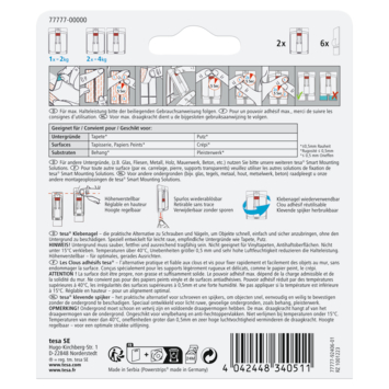 Tesa clous adhésifs réglables papier peint et plâtre 2 kg 2 pièces et les bandes adhésives fournies garantissent une adhérence fiable sur des surfaces inégales et sensibles et ont une capacité de charge maximale de 2 kg par clou. Le réglage en hauteur les rend adaptés à l'alignement vertical des cadres. La technologie des barrettes d'alimentation garantit que le clou peut être retiré. Rien n'est laissé derrière sauf une surface propre et intacte. Le papier peint et le plâtre à ongles adhésifs réglables Tesa 2 kg 2 pièces peuvent être réutilisés avec une nouvelle bande adhésive tesa. Assemblage facile sans marteau ni perçage.