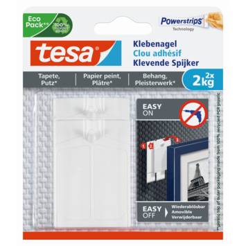 Tesa clous adhésifs papier peint et plâtre 2 kg 2 pièces et les bandes adhésives fournies ont été spécialement développés pour monter facilement des objets avec une adhérence fiable sur des surfaces inégales et sensibles. Les clous adhésifs ont une capacité de charge allant jusqu'à 2 kg par clou. Tesa clous adhésifs papier peint et plâtre 2 kg 2 pièces sont le moyen d'accrocher des peintures ou des décorations sans causer de dommages. Grâce à la technologie des barrettes d'alimentation, elles sont super faciles à utiliser et peuvent être retirées sans laisser de trace. Vous pouvez même réutiliser le clou adhésif avec une nouvelle bande adhésive.