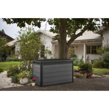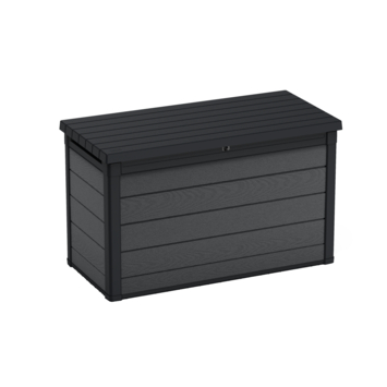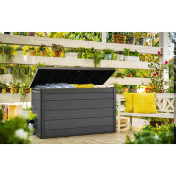 Le coffre de rangement Cortina très spacieux (757 litres) peut contenir tous les coussins de jardin et autres objets que vous voulez avoir sous la main. Tout y est stocké au sec. Le coffre à coussins de jardin peut être fermé avec un cadenas (non inclus). L'armoire à coussins a un aspect bois attrayant et est fabriquée en plastique durable et résistant aux intempéries. Le couvercle est équipé de ressorts à gaz. Le coffre est robuste et peut également servir de siège à deux adultes.