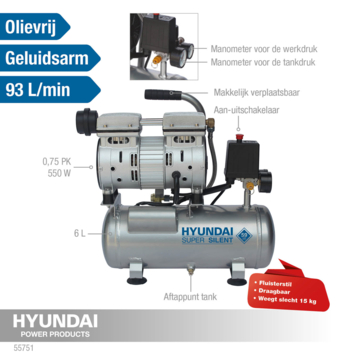 Souffler, gonfler ou conduire pneumatiquement ? Ce compresseur Hyundai solide comme le roc mais puissant fournit de l'air dans toutes les situations.La machine aspire l'air, le comprime dans le réservoir spacieux de 6 litres, puis le libère de manière dosée via le tuyau ou l'outil auxiliaire connecté.Un appareil très flexible pour nettoyer - et souffler la saleté, gonfler toutes sortes de pneus et de matériaux et alimenter des appareils et des outils (industriels), Un compresseur sans huile adapté aux professionnels et aux bricoleurs, Ce compresseur Hyundai spécialement conçu est équipé d'un très moteur silencieux, donc le niveau de bruit est minimal ; seulement 59 dB, Idéal pour une utilisation dans des endroits où beaucoup de bruit cause beaucoup de nuisances, De plus, le compresseur est très stable grâce à sa conception extra robuste ; quatre repose-pieds avec capuchons anti-vibrations, Ce compresseur est équipé d'un manomètre de réservoir, d'un régulateur de pression, d'un manomètre de régulateur de pression et d'un raccord rapide orion/eu, facilitant la connexion des outils pneumatiques, Spécifications uniques ; - Soufflage propre, gonflage et conduite pneumatique, - Tension ; 230V - 50 Hz, - Contenu de la chaudière ; 6 litres, - Pression maximale de travail ; 8 bar, - Puissance moteur : 550W / 0,75 CV, - Nombre de cylindres ; 2, - Complètement sans huile, - Diamètre du cylindre ; 42 mm, - Vitesse ; 13500 par/minute, - Classe d'isolation moteur ; B, - Puissance d'aspiration ; 93 litres/min, - Niveau sonore ; seulement 59dB(!), - Support anti-vibration ; 4 repose-pieds, - Dimension d'utilisation ; 35x41x42cm - Poids ; 15 kilogrammes, - Garantie ; 2 années,