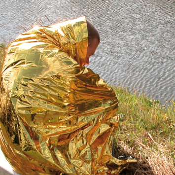 We gebruiken de reddingsdeken als bescherming tegen de schadelijke elektromagnetische straling die van de telecomtoren op 300 m van ons huis rechtstreeks op de voorkant van ons huis binnenkomt. Deze deken was groot genoeg om het muurtje van onze badkamer te bedekken en we verwachten dat we daardoor veel minder straling binnenkrijgen.