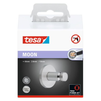 Le crochet porte-serviettes tesa® Moon a un design attrayant et une finition en acier inoxydable avec traitement anti-empreintes digitales. Il peut-être monté sans perçage grâce à la technologie unique tesa® Power.Kit. Le montage est très simple : 1) Collez l'adaptateur sur le mur et remplissez-le avec l'adhésif tesa® Power.Kit 2) Laissez l'adhésif durcir pendant 12 heures 3) Vissez le crochet sur l'adaptateur. Tous les matériaux nécessaires sont inclus dans le colis : crochet et kit de montage. Ce crochet a un design élégant et tendance. Le crochet à serviette peut être facilement retiré sans résidus de colle ni dommages. Il peut-être réutilisé avec le jeu d'adaptateurs BK73, qui peut également être acheté séparément. Convient pour les carreaux, le métal, la pierre naturelle, le marbre, le béton, le bois, le verre et de nombreux types de plastique. Ne convient pas aux papiers peints, stucs et autres surfaces avec un revêtement antiadhésif. La série Moon se compose de divers accessoires, découvrez le reste de la gamme.