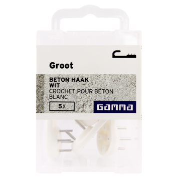 Ce grand crochet à béton GAMMA est en nylon blanc. Avec un crochet en béton, vous pouvez facilement monter un crochet sur un mur en béton ou dans un mur en pierre. C'est-à-dire : sans utiliser de perceuse. Vous pouvez facilement fixer les 4 clous en acier dans le béton avec un marteau. Dans les types de pierre plus tendres, vous pouvez utiliser un clou en acier plus long. Un trou a été laissé ouvert entre les clous à cet effet. Le crochet est assez facile à enlever avec une pince. Ces grands crochets mesurent 5x2x1,7cm. Un paquet contient 5 morceaux de crochets en béton.