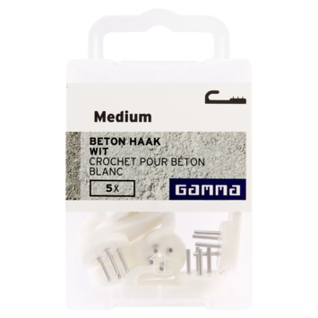 Ce crochet à béton GAMMA de taille moyenne est en nylon blanc. Avec un crochet en béton, vous pouvez facilement monter un crochet sur un mur en béton ou dans un mur en pierre. C'est-à-dire : sans utiliser de perceuse. Vous pouvez facilement fixer les 4 clous en acier dans le béton avec un marteau. Dans les types de pierre plus tendres, vous pouvez utiliser un clou en acier plus long. Un trou a été laissé ouvert entre les clous à cet effet. Le crochet est assez facile à enlever avec une pince. Ce crochet de taille moyenne a une taille de 3x1,5x0,8cm. Un paquet contient 5 morceaux de crochets en béton.