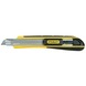 Le couteau sécable Stanley FatMax 9 mm (0-10-475) est un couteau petit mais solide pour les amateurs qui convient à toutes sortes de travaux dans et autour de la maison. Vous pouvez facilement faire glisser le couteau vers l'intérieur et l'extérieur grâce au curseur ergonomique. Le couteau est en acier inoxydable et donc très résistant. Le couteau a un magasin intégré avec 6 lames de rechange afin que vous ayez toujours une lame de rechange à portée de main pour continuer à travailler. Vous pouvez casser les lames rapidement et en toute sécurité à l'aide du capuchon de rupture amovible. Le couteau est équipé d'un nettoyeur de lame qui vous permet d'éliminer la saleté et la poussière. Grâce au blocage de la lame et à une résistance jusqu'à 20 kg de force de pression lors de la coupe, vous pouvez travailler en toute sécurité et avec précision. Le couteau sécable Stanley a une lame de 9 mm de large et 138 mm de long.