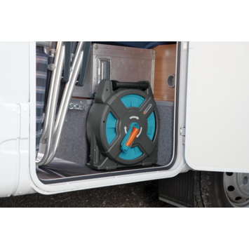 De tuinslang op zich is soepel (een iets dunnere diameter dan gebruikelijk) en rol zich goed op in de gesloten box. Deze box is handig om onder te brengen.