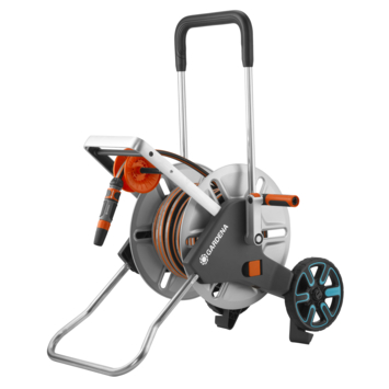 Le dévidoir AquaRoll M Metal GARDENA est très solide et robuste, il est idéal pour les tâches lourdes dans le jardin. Il permet de ranger de manière compacte le tuyau d’arrosage. Le tuyau s’enroule facilement grâce à la manivelle ergonomique avec composants doux. Grâce au support de base repliable, le dévidoir ne tombe pas lorsque le tuyau est déroulé. Les grandes roues surélevées offre au dévidoir une grande stabilité. Pour un rangement compacte, il est possible de replier le support de base, plier la manivelle et descendre la poignée. Le dévidoir AquaRoll M complet est prêt à l’emploi et équipé d’un tuyau de 25 m Flex 13 mm (1/2’’), accessoires Original GARDENA System et une lance.