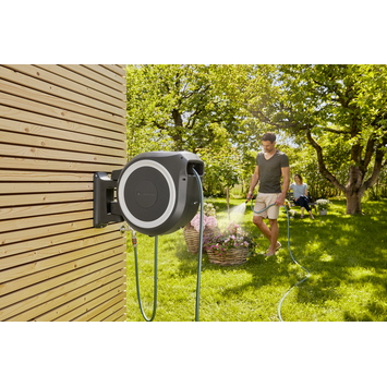 Le dévidoir automatique mural RollUp XL 35 m GARDENA est idéal pour arroser les très grands jardins. C’est une solution d’arrosage et de nettoyage très pratique pour avoir son tuyau d’arrosage toujours prêt à l’emploi et bien rangé. Une fois fixé au mur, le dévidoir automatique et mural GARDENA peut pivoter à plus de 180° afin de pouvoir arroser les moindres recoins du jardin ou de la terrasse. Il suffit de tirer sur le tuyau d’arrosage pour le dérouler puis de le relâcher pour l’enrouler. Grâce à la technologie RollControl, le dévidoir automatique mural GARDENA est équipé d’un frein centrifuge, d’un ressort en acier de haute qualité pour un enroulement toujours fiable et homogène du tuyau et d’un guide-tuyau intégré pour éviter les torsions lors de l'enroulement du tuyau. Le dévidoir GARDENA est équipé d’un nez de robinet accessible directement sur le flanc pour permettre une connexion/ déconnexion ou une extension faciles du tuyau de raccordement. Un verrouillage du tuyau s’effectue à intervalles courts et réguliers (50 cm) pour permettre une manipulation sans effort du dévidoir automatique mural RollUp XL 35 m GARDENA. Une fois fixé au mur, le dévidoir peut être utilisé toute l’année car il dispose d’une protection anti-gel et anti-UV. Garantie 5 ans – Couleur : blanc.