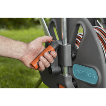 Compact et astucieux, le CleverRoll L se range sans perte d’espace : la manivelle se replie d’une simple pression sur un bouton et la poignée réglable en hauteur s’adapte à chaque utilisateur, tout en permettant un stockage minimal. Pour plus de confort, la manivelle peut être montée à droite ou à gauche. Résistant au gel, le dévidoir se conserve aisément en hiver. Il est équipé d’un raccord de tuyau coudé qui évite les plis et torsions lors de l’enroulement ou du déroulement, tandis qu’un guide tuyau garantit un enroulement uniforme. Enfin, seule la manivelle repliable est actionnée, ce qui permet de garder les mains propres, et le grip sur la poignée offre une prise en main confortable