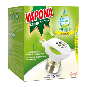 Le diffuseur electrique de parfum ProNature Vapona contient 5 huiles naturelles essentielles et diffuse une senteur agreable pendant 45 jours. Comme recharge il y a une recharge liquide (art 148689) ou des tablettes (art 148692).